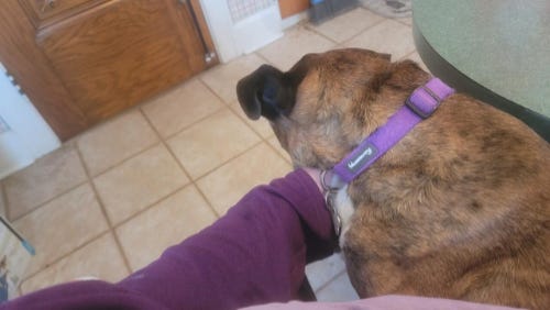 The first thing that’s making this a rough winter is that my dog has developed a thing called Megaesophagus, which is basically an enlarged esophagus. The nerve that controls it is not working and doesn’t move food or water properly into his stomach. This means he regurgitates everything he puts into his mouth unless he’s held in a sitting position for a period of time afterwards. At the moment, I’m catching him as he finishes eating or drinking and kind of draping his front feet/legs over my thigh for ten to fifteen minutes. We seem to have breakfast and lunch figured out, but his after-supper time will need to be extended, because that seems to be the hardest time of the day for him. I’m looking into options … either a custom-made Bailey chair or some sort of alternative that does not involve my lap. LOL
